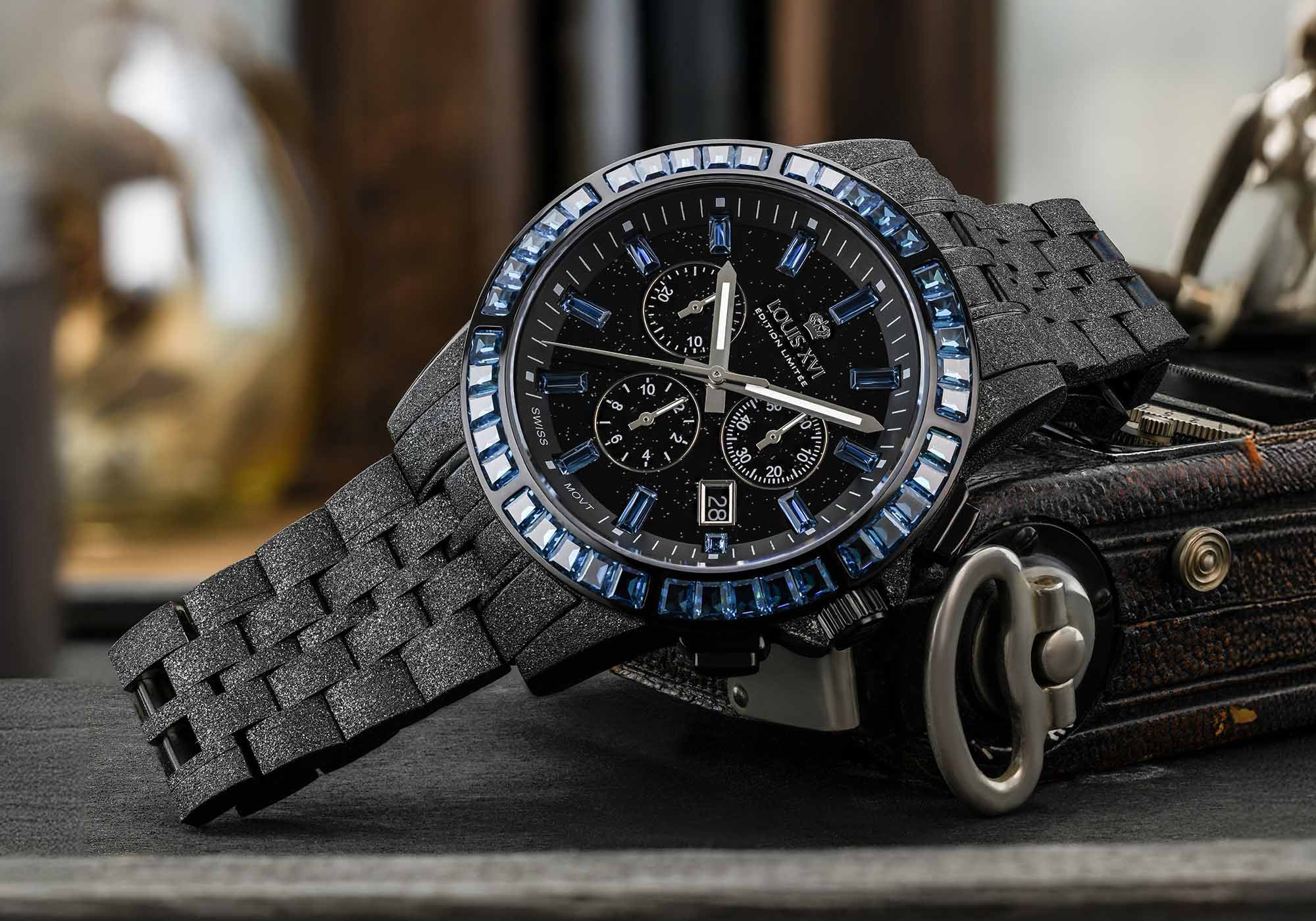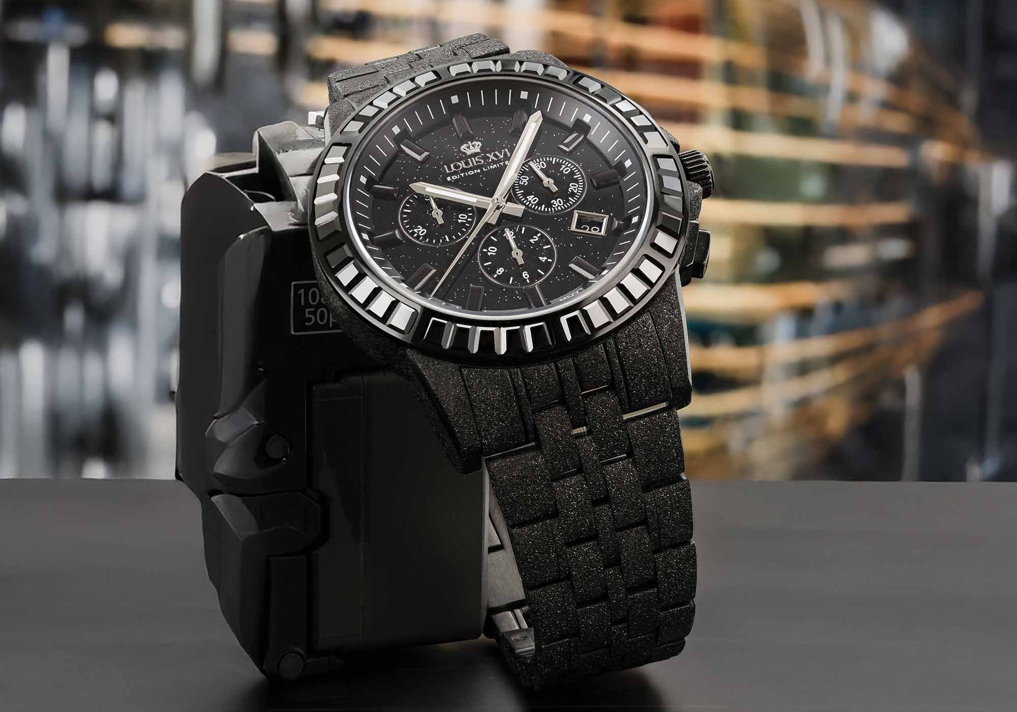 Durch feinstes Microhammering wird der Stahl veredelt und erhält eine matte Oberfläche, die die glänzende Schicht entfernt. Diese Bearbeitung macht ihn besonders kratzfest, da Gebrauchsspuren nahezu unsichtbar bleiben. Mit der abschließenden schwarzen PVD-Schicht wird daraus Black Frosted – eine Oberfläche, die die Tiefe von Schwarz mit der Eleganz funkelnder Eiskristalle vereint.