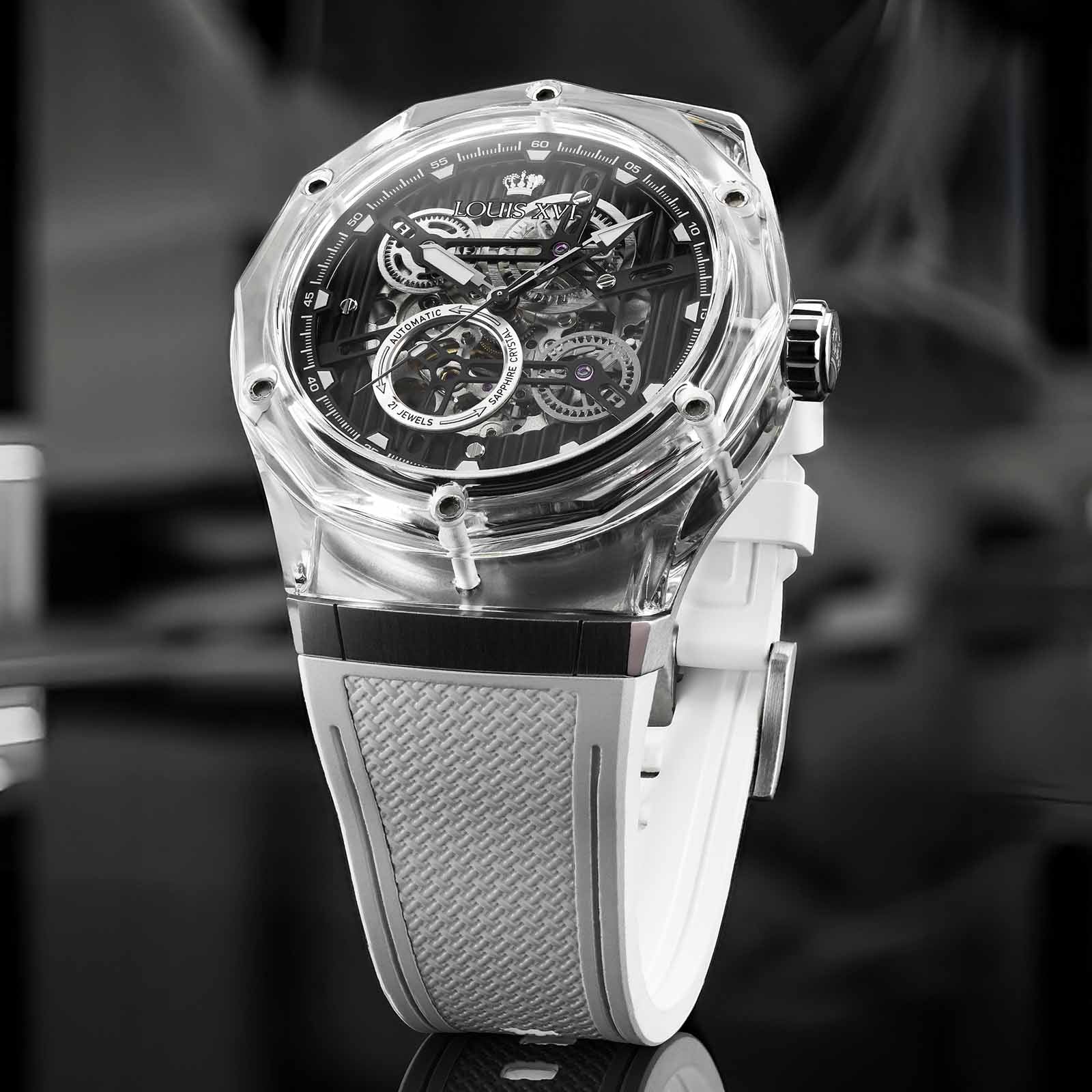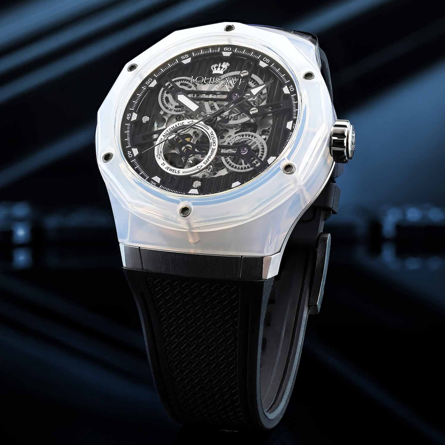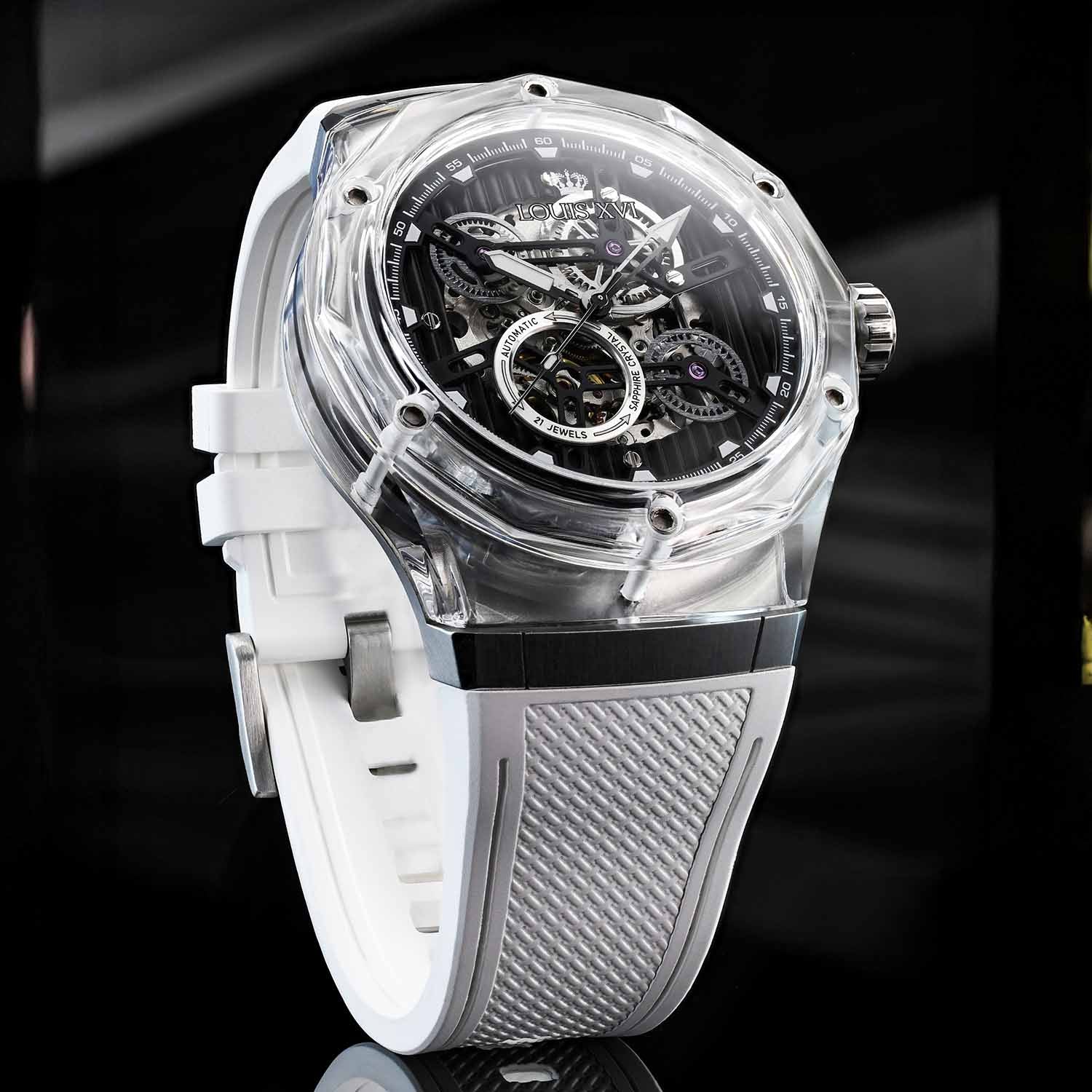 هذا المادة، المعروفة في البصريات والعمارة، تفتح بُعدًا جديدًا تمامًا. الشفافية، لعبة الضوء والعمق تندمج لتشكل جمالية لا يمكن لأي ساعة أخرى أن تقدمها. كل حركة للمعصم تجعل العلبة تتألق بشكل مختلف – أحيانًا واضحة، وأحيانًا غنية بالألوان، دائمًا فريدة.