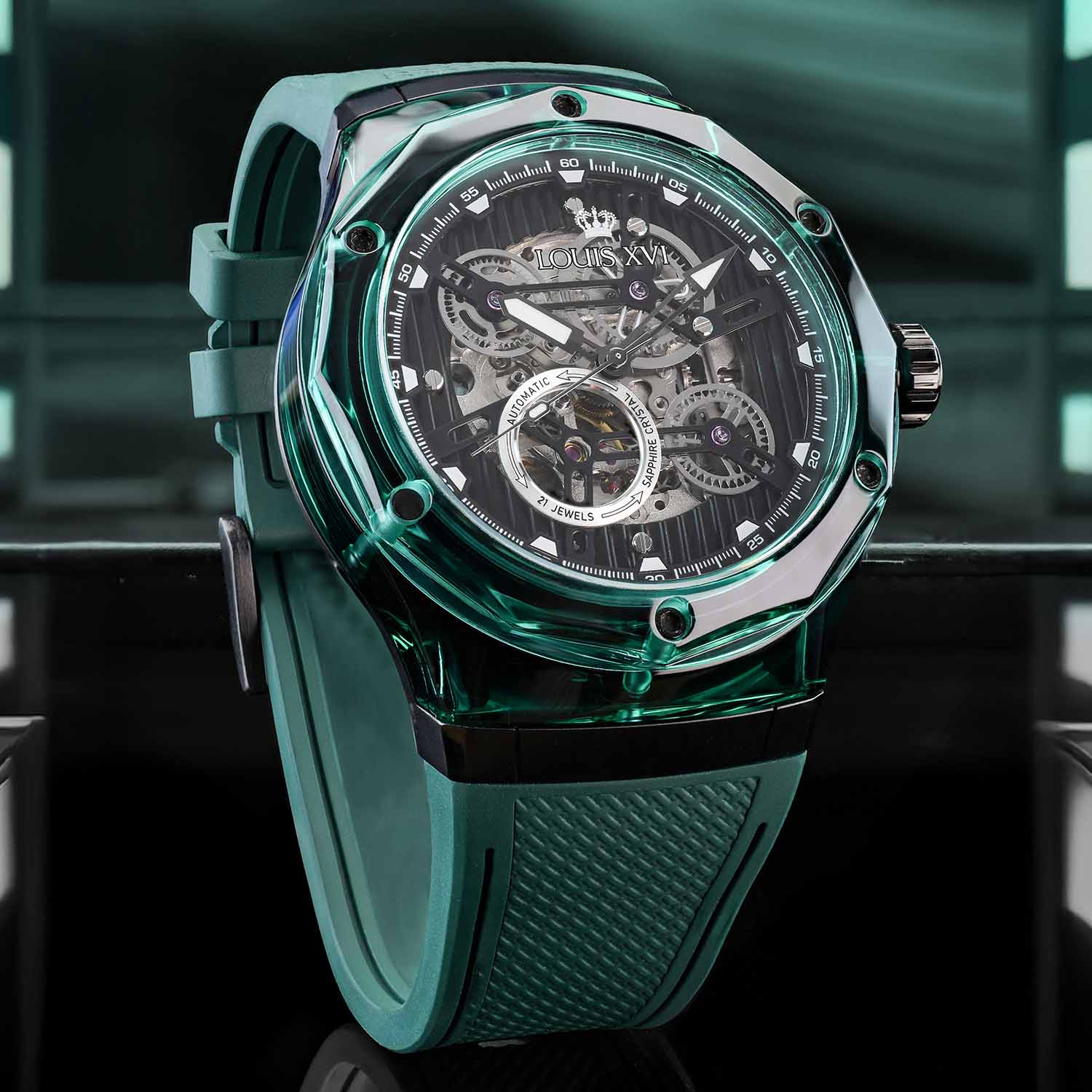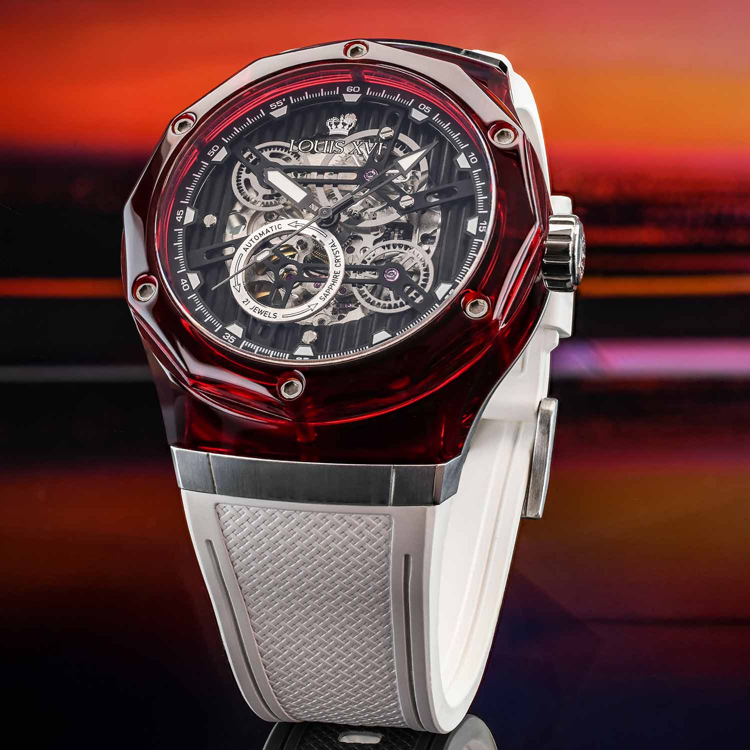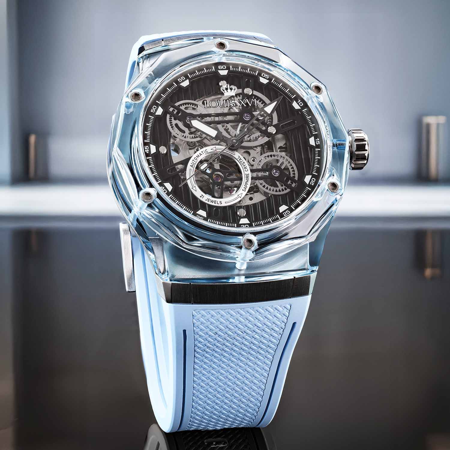 هذا المادة، المعروفة في البصريات والعمارة، تفتح بُعدًا جديدًا تمامًا. الشفافية، لعبة الضوء والعمق تندمج لتشكل جمالية لا يمكن لأي ساعة أخرى أن تقدمها. كل حركة للمعصم تجعل العلبة تتألق بشكل مختلف – أحيانًا واضحة، وأحيانًا غنية بالألوان، دائمًا فريدة.