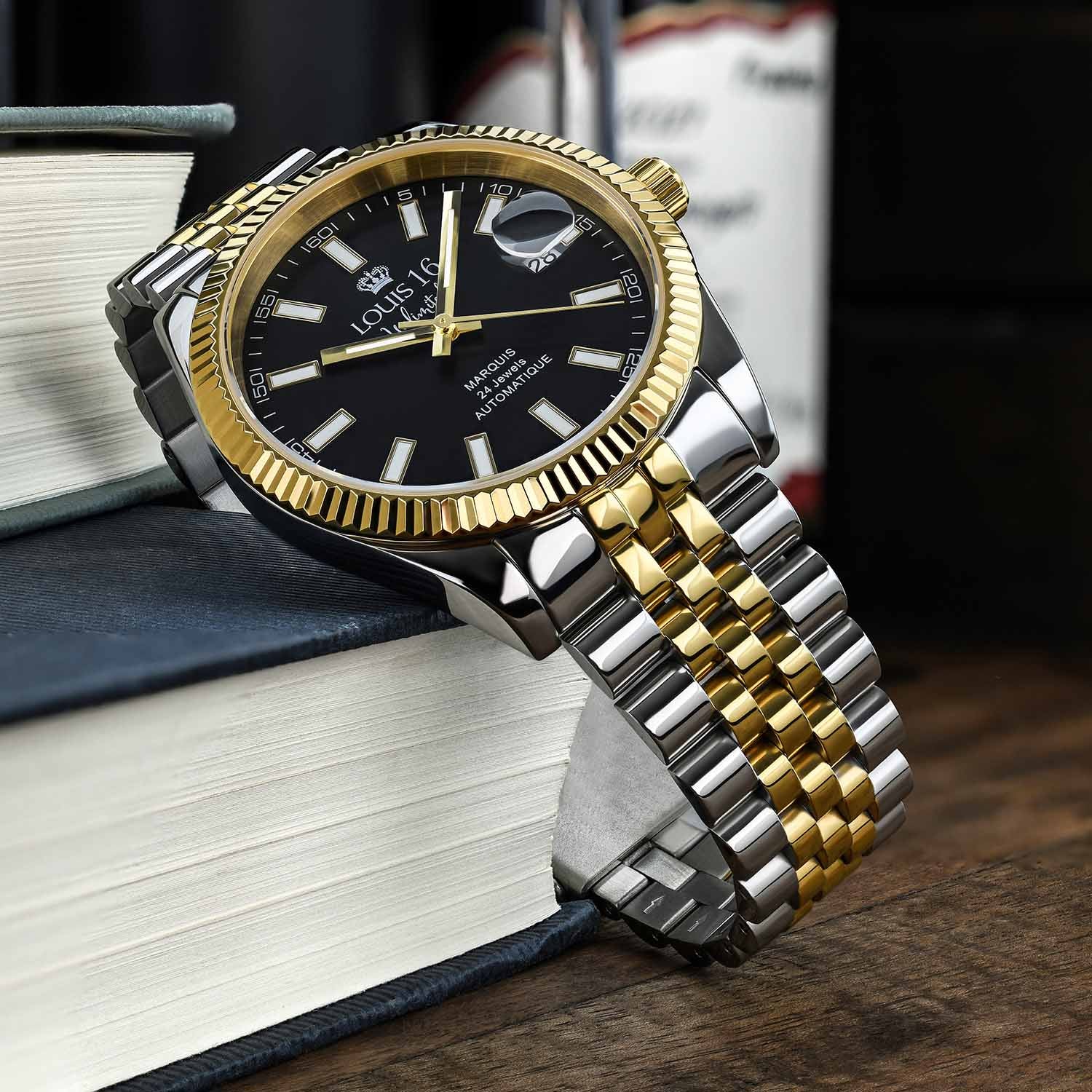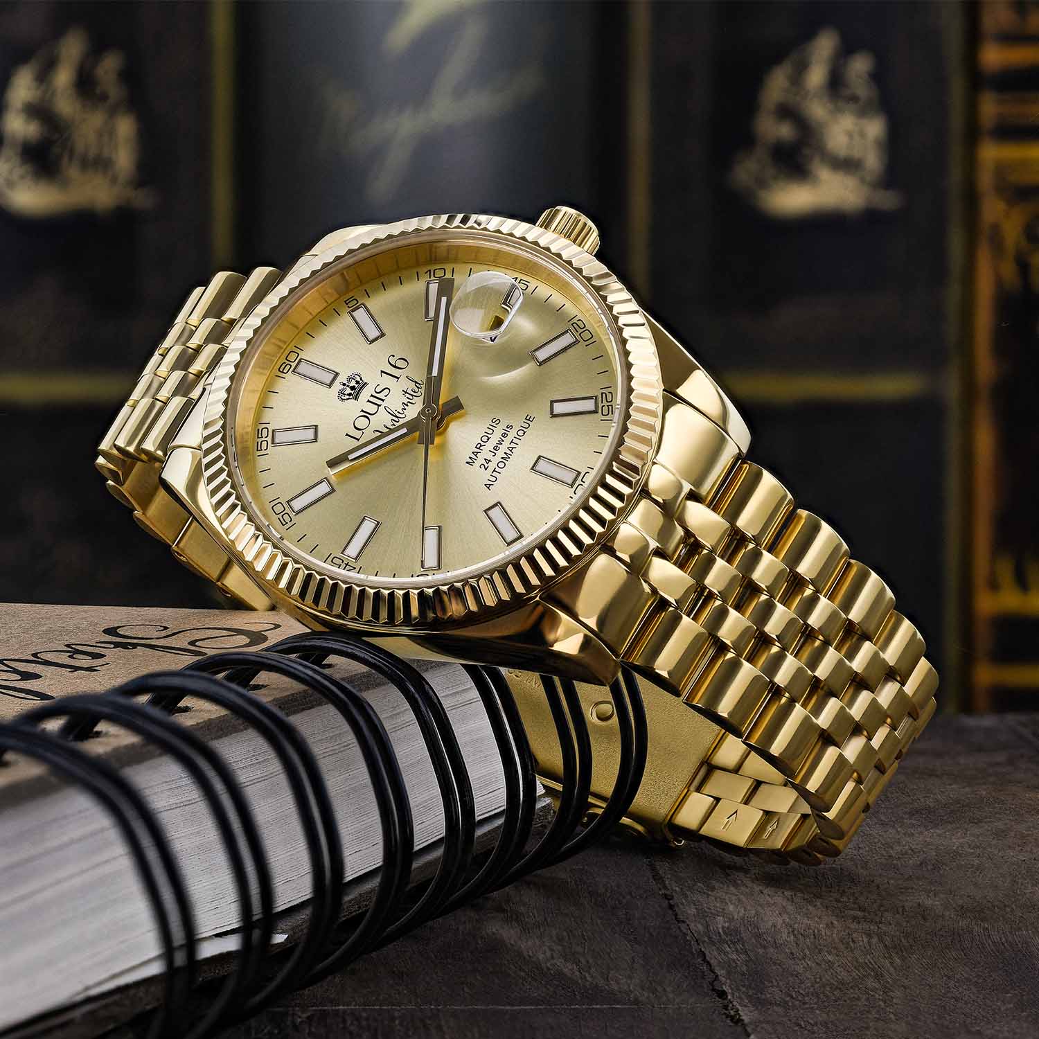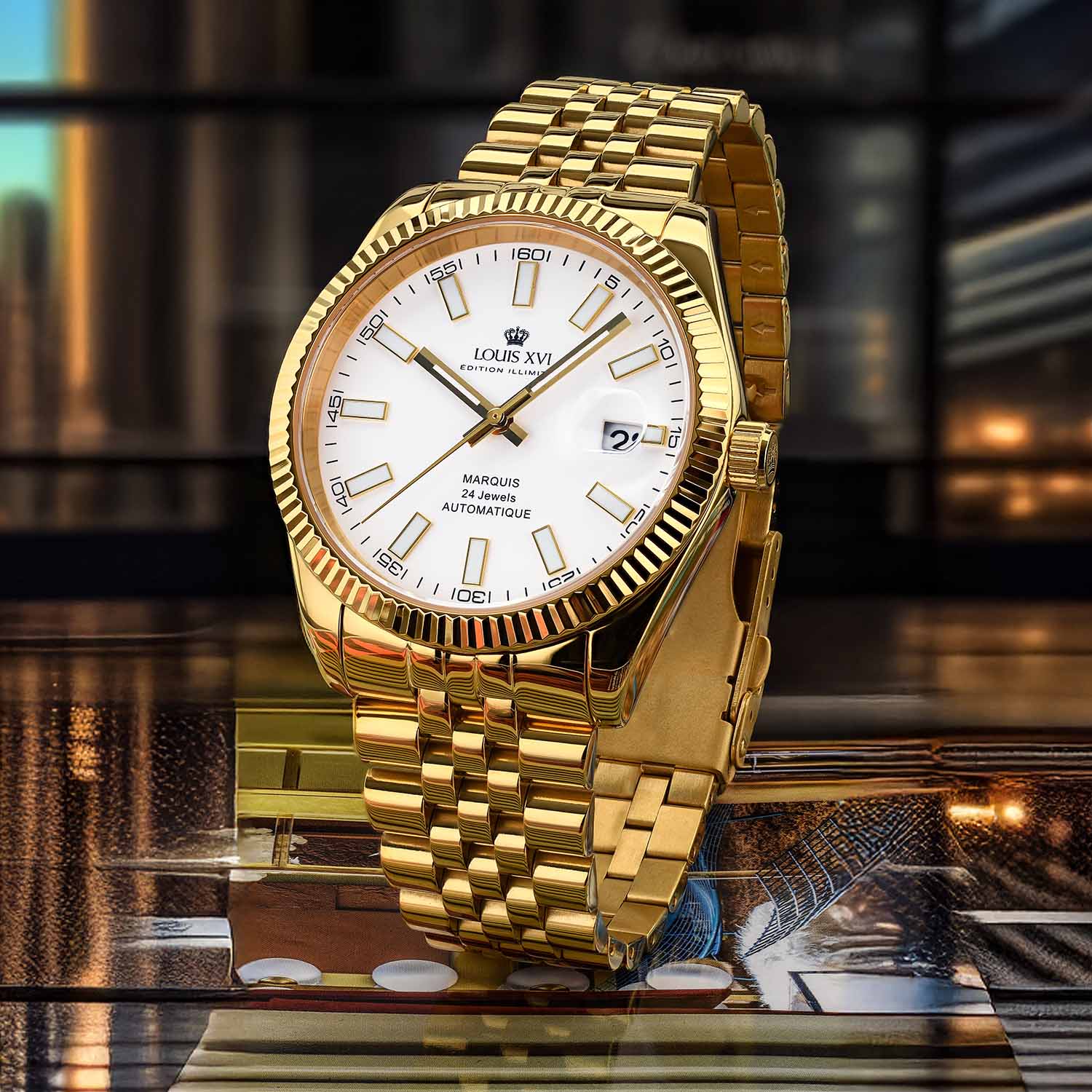 تم تصميم كل ساعة في مجموعة Marquis للأشخاص الذين يقدرون الجودة والرقي. سواء كانت بلمسة نهائية ذهبية لامعة أو باللون الأسود المذهل مع مؤشرات فضية، تجمع مجموعة Marquis بين التقليد والحداثة بطريقة لا تضاهى.