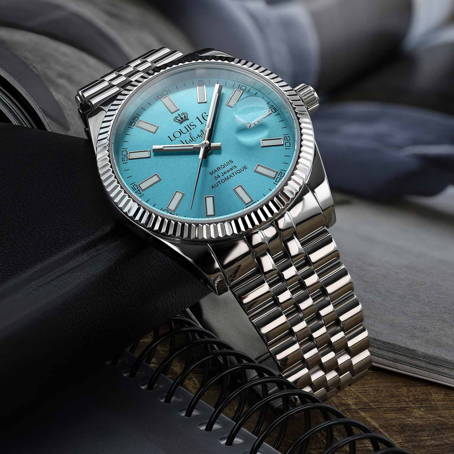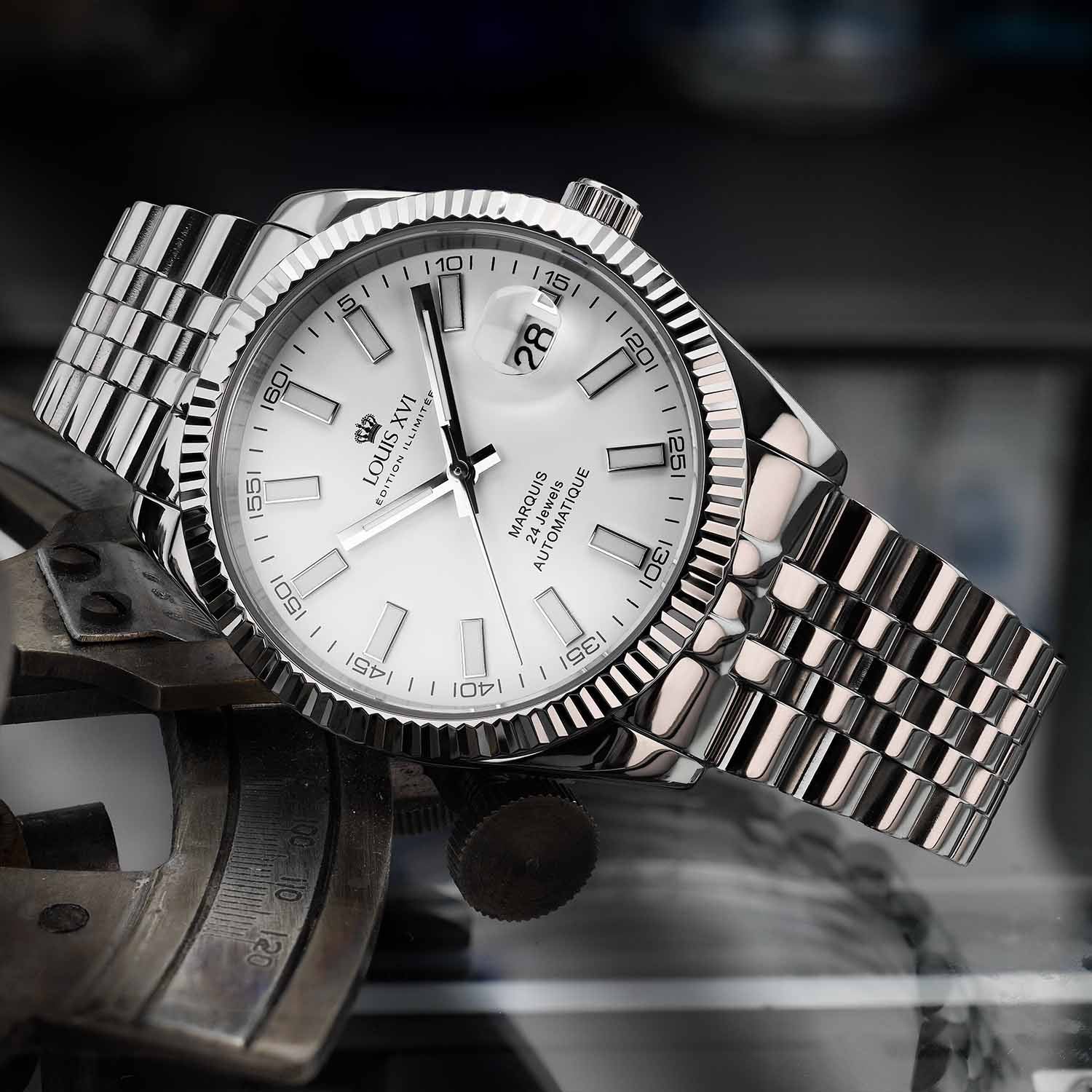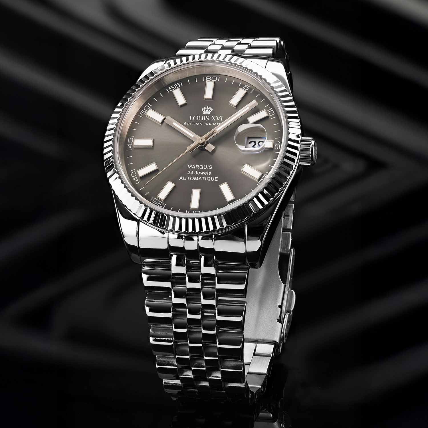 تم تصميم كل ساعة في مجموعة Marquis للأشخاص الذين يقدرون الجودة والرقي. سواء كانت بلمسة نهائية ذهبية لامعة أو باللون الأسود المذهل مع مؤشرات فضية، تجمع مجموعة Marquis بين التقليد والحداثة بطريقة لا تضاهى.