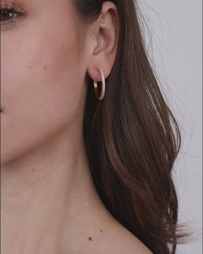 Diese goldfarbenen Creolen schmiegen sich mit einer vollen, harmonischen Rundung an das Ohr. Entlang der gesamten Linie entfaltet die dichte Diamantfassung ein gleichmäßiges, feines Funkeln.