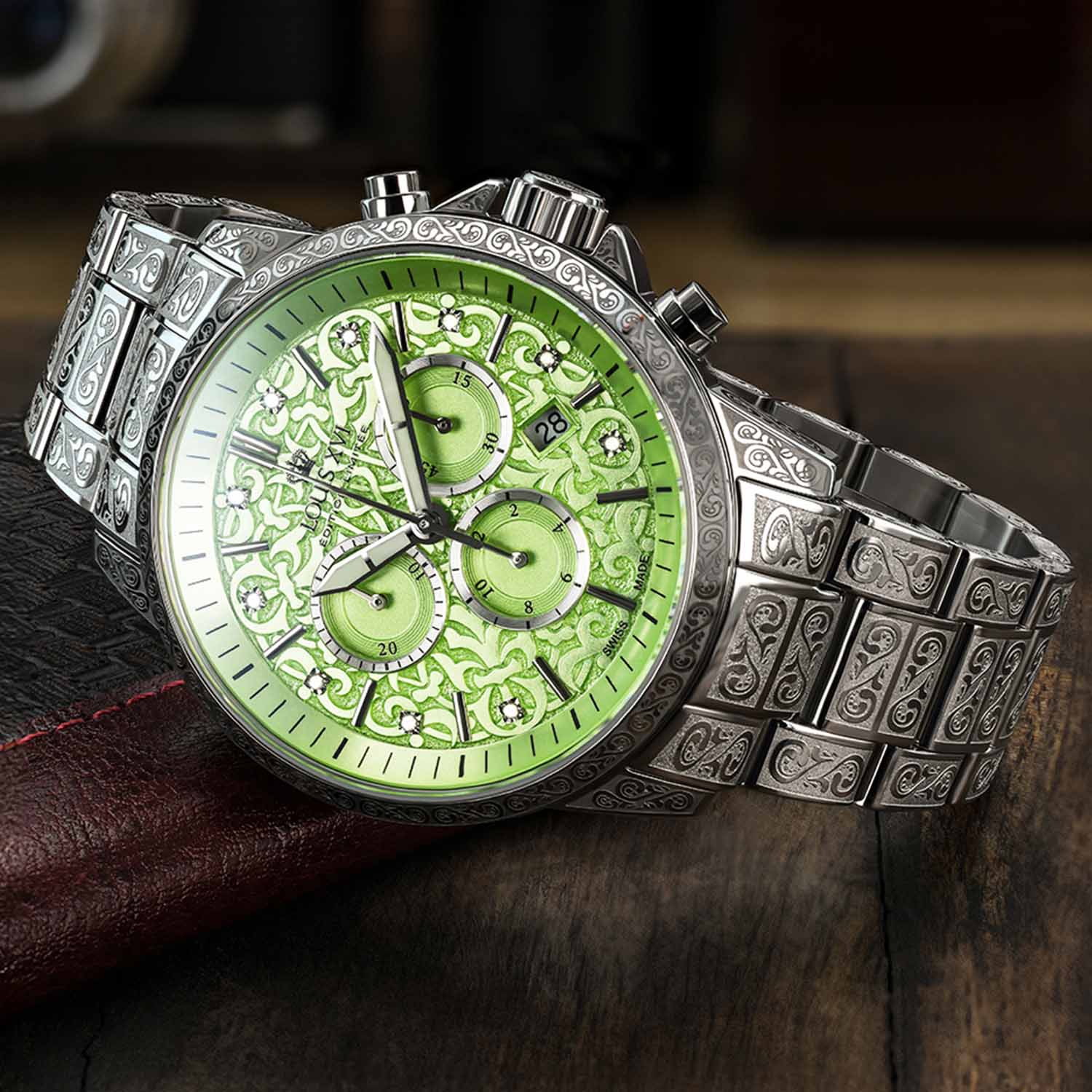 Friske, ædle farver som Ocean Blue, Butter Yellow, Mojito Green og Peach Orange beriger denne fortryllende kollektion. En blid glans giver dem det visse noget. Vi er overbeviste om, at disse farver vil fremhæve kollektionens uforglemmelige karakter endnu mere intenst og bringe skønheden i disse ure perfekt frem. Bær dette ur med stolthed – det er noget unikt og specielt, præcis som dig!