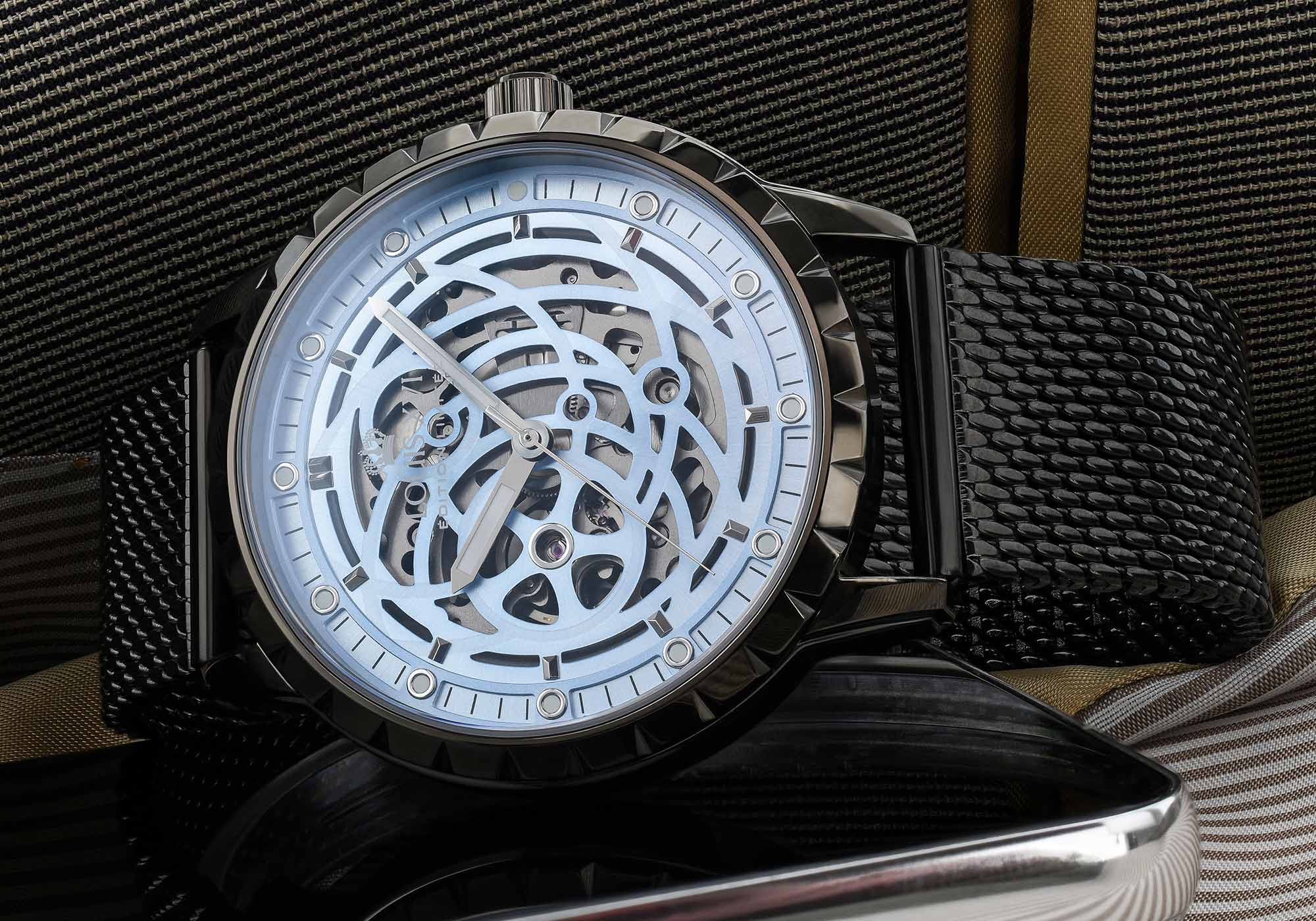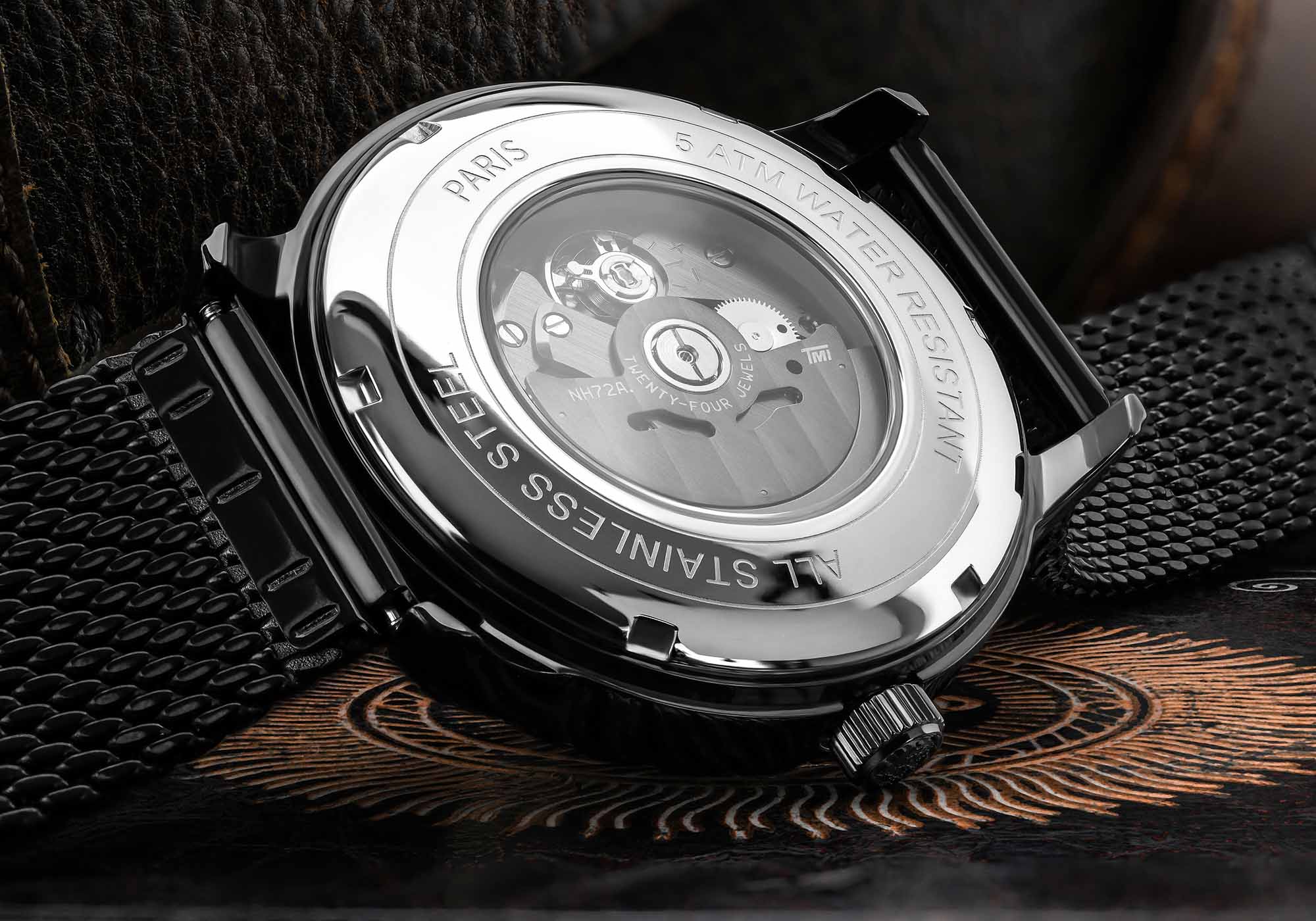 Den skeletterede urskive på Paris 2.0 giver udsigt til det præcise automatikværk. Hver bevægelse, hver detalje bliver synlig – et fascinerende samspil af håndværk og moderne teknik, der gør tiden til en oplevelse.