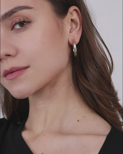 Diese Ohrringe zeigen eine ausgewogene Form und ein ruhiges Verhältnis der Proportionen. Gold- und Silberton setzen am Ohr einen klaren, zugleich weichen Kontrast.