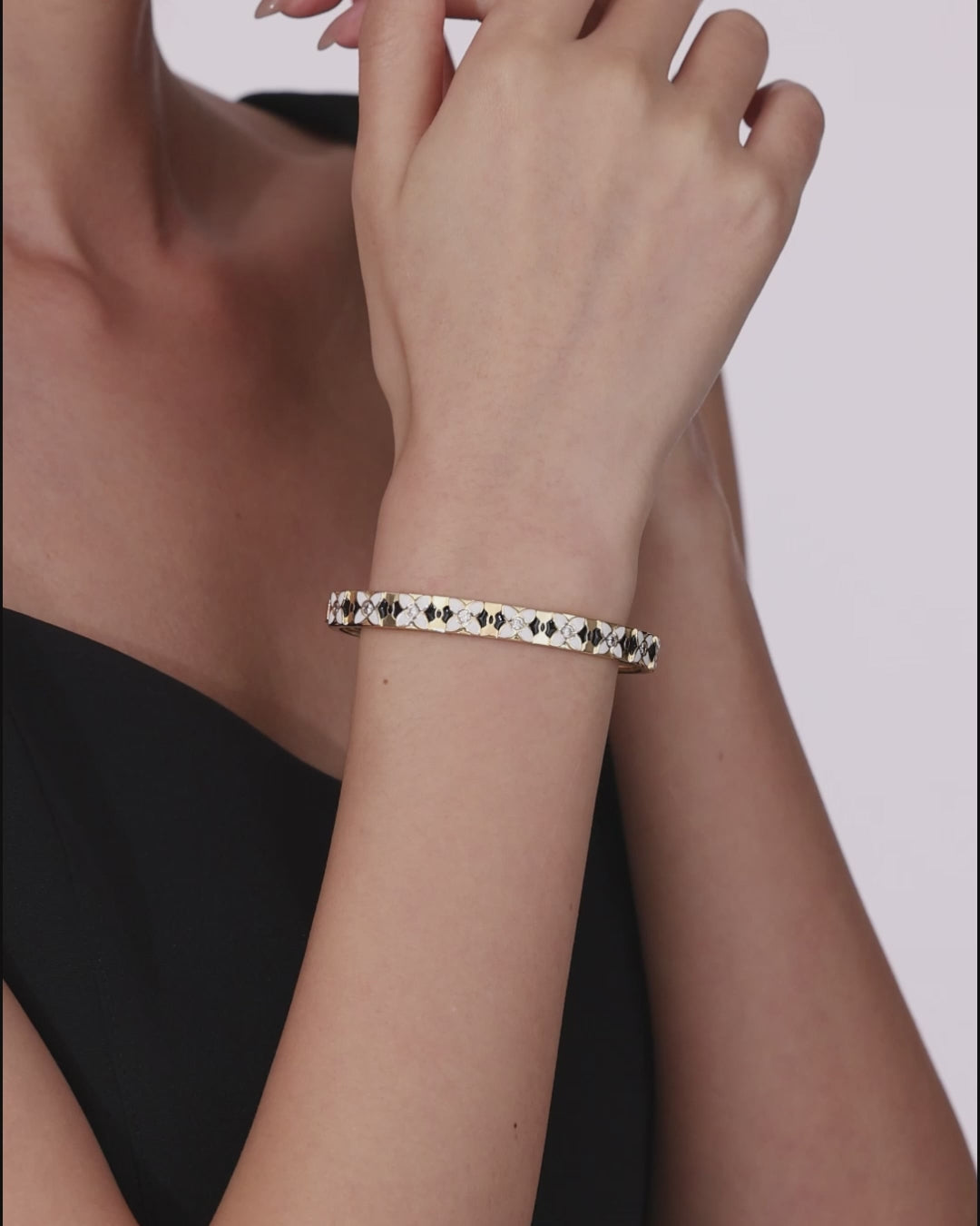 Elfenbeinweiße und schwarze Emaille wechseln sich auf den Blütenblättern ab. In Kombination mit dem warmen Schimmer des Gelbgolds entsteht ein harmonisches Zusammenspiel aus Tiefe und Leuchtkraft. Die sanfte Anmutung der Emaille und die klassische Ausstrahlung des Goldes schaffen ein ausgewogenes Spannungsfeld zwischen Eleganz und Ausdrucksstärke. Die feinen Proportionen des Armreifs verleihen dem Schmuckstück eine leichte, unaufdringliche Präsenz und schmiegen sich harmonisch an die Linien des Handgelenks an.
