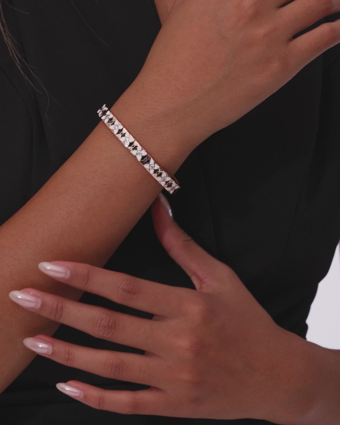 Elfenbeinweiße und schwarze Emaille wechseln sich auf den Blütenblättern ab. Der warme Roségoldton verleiht dem Schmuckstück eine weiche, elegante Ausstrahlung und betont die florale Formensprache der Blüten. Die harmonische Verbindung von Emaille und Roségold schafft eine subtile Balance zwischen Romantik und moderner Klarheit. Die feinen Proportionen des Armreifs schmiegen sich sanft an das Handgelenk und sorgen für ein angenehmes Tragegefühl.