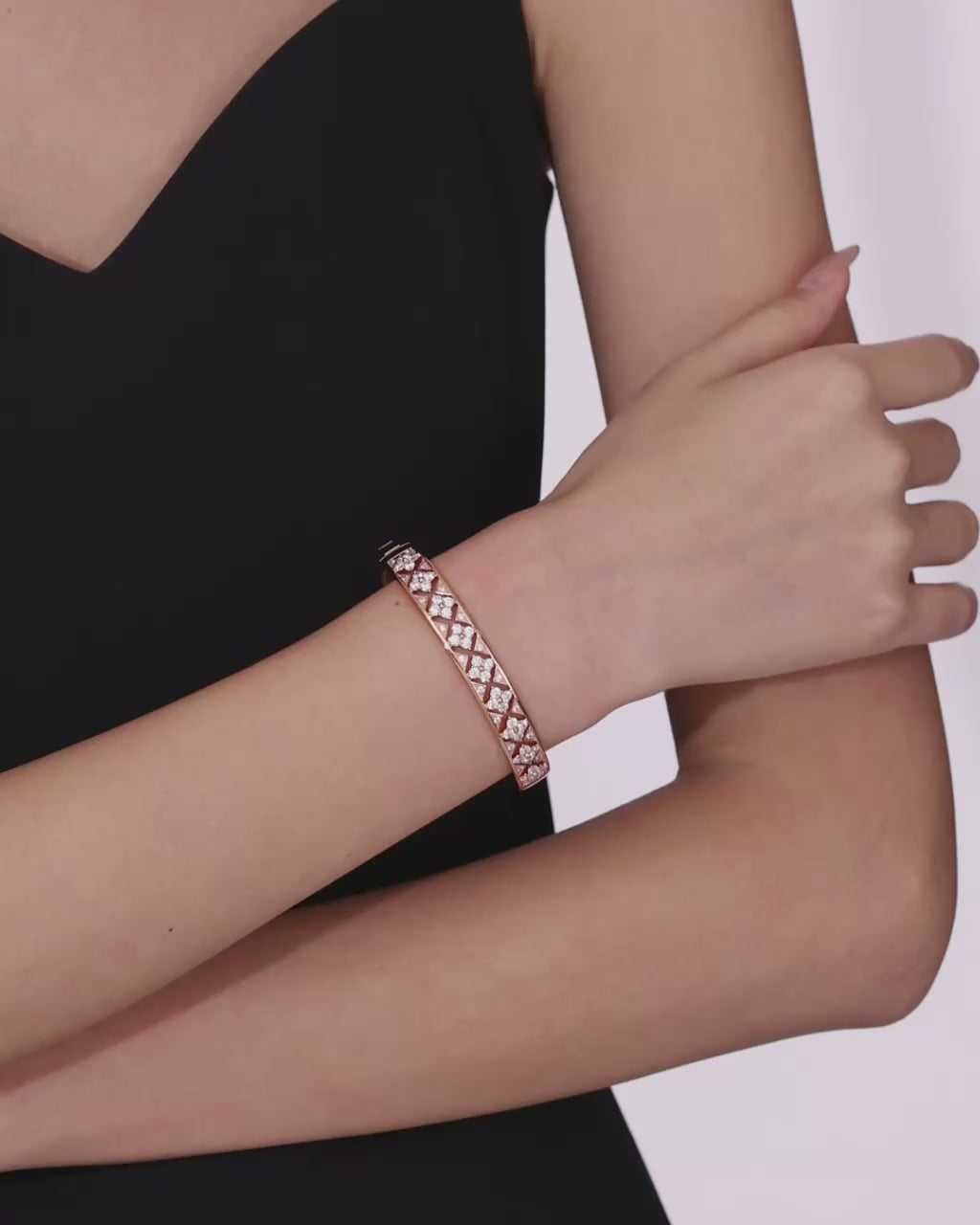 Der FLORALE Armreif zeigt ein durchgehendes florales Muster, in dem Zirkonia und Metallstruktur rhythmisch miteinander verbunden sind. Die Form liegt angenehm am Handgelenk an.