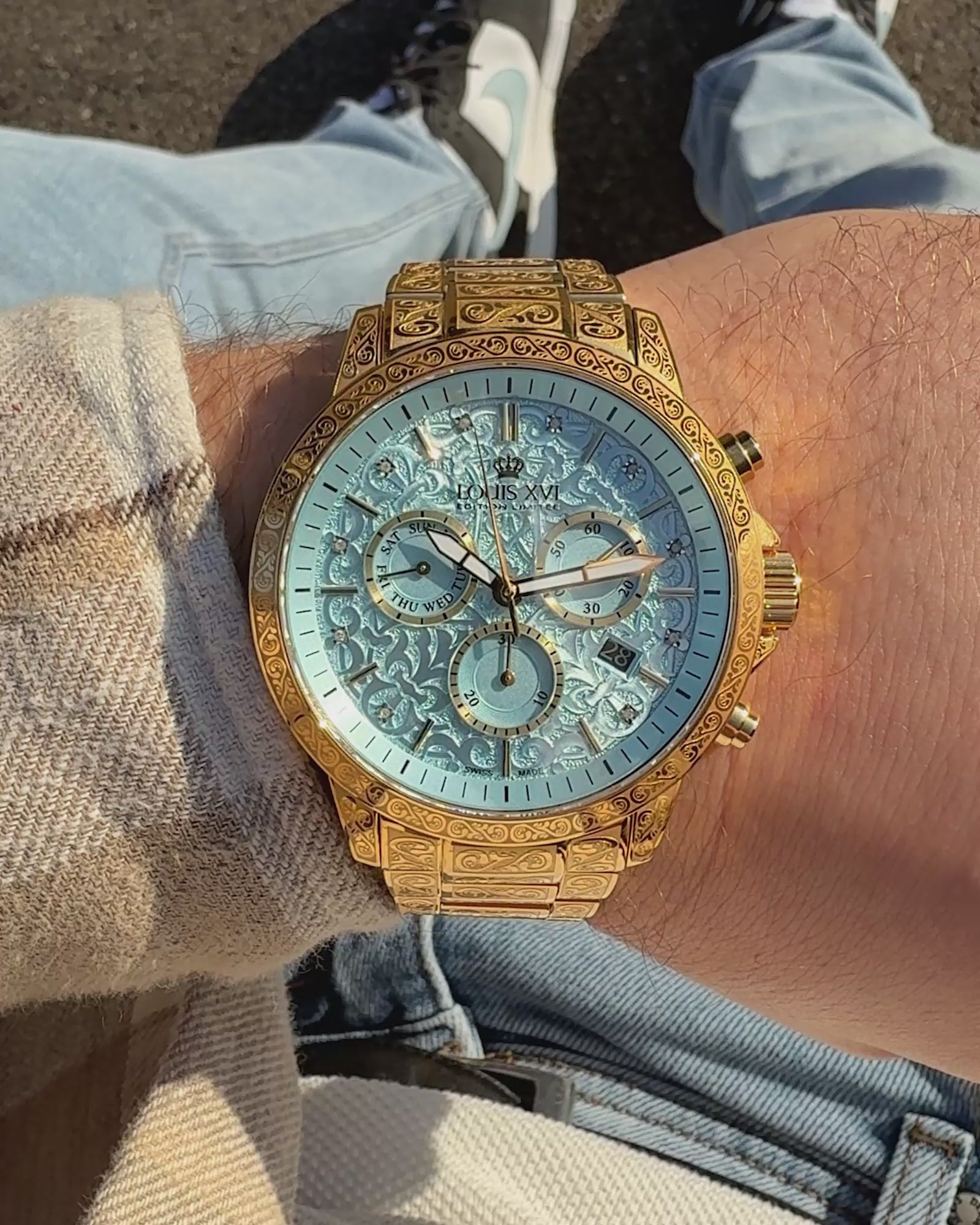 Das vollständig gravierte Gehäuse und Armband aus 316L-Edelstahl präsentieren sich in strahlendem Goldton, dessen Wärme einen wunderschönen Kontrast zur kühlen Eleganz des Baby-Blue-Zifferblatts bildet. Diamantähnliche Akzente verleihen dem Design zusätzliche Brillanz.