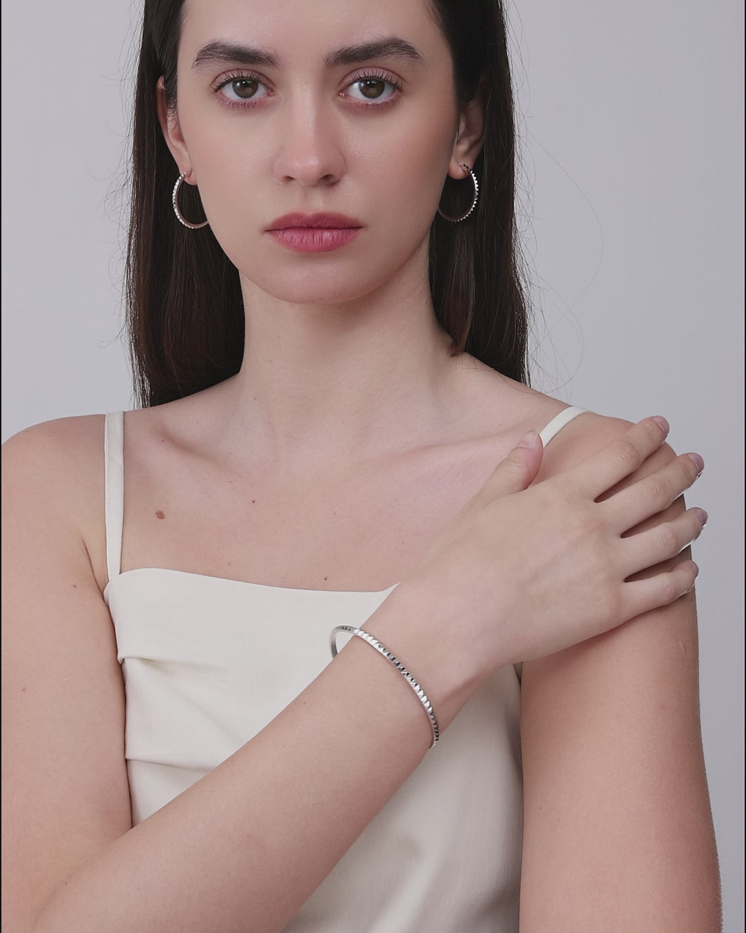 Das Valenza Armband in Silber betont die Kraft der nietenartigen Facettierung durch eine kühle, klare Metallwirkung. Die geometrischen Schnitte erzeugen ein präzises, modernes Lichtspiel mit starker Spannung.