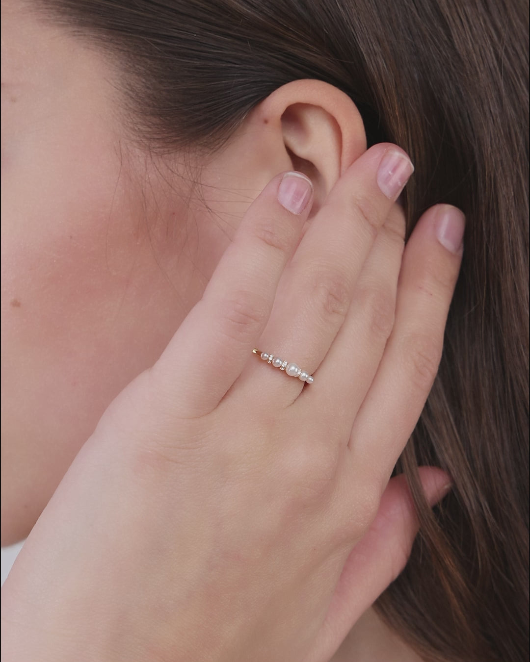 Der warme Goldton unterstreicht den weichen Schimmer der Perlen und schafft eine ausgewogene Verbindung von Eleganz und Alltagstauglichkeit. Ein zeitloser Ring, der durch Ruhe und Präzision überzeugt.