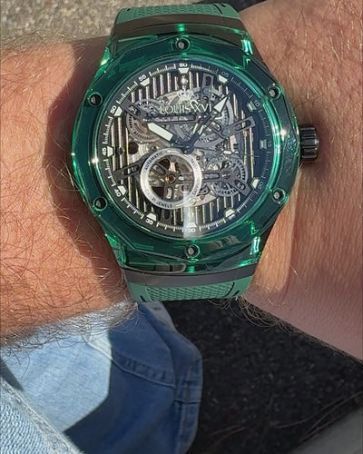 Mit der La Lumière Ref. 3825 – Boa Green zieht eine außergewöhnliche Farbvariation in die Kollektion ein. Das aus K9 Glas gefertigte Gehäuse erstrahlt in einem intensiven, smaragdähnlichen Grünton, der an die Kraft und Eleganz exotischer Schlangen erinnert. In Kombination mit dem farblich abgestimmten Kautschukarmband entsteht ein harmonischer, zugleich markanter Look.