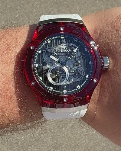 Die La Lumière Ref. 3890 – Ruby Red ist Leidenschaft in ihrer reinsten Form. Das Gehäuse aus K9 Glas erstrahlt in tiefem Rubinrot und erinnert an funkelnde Edelsteine, die im Licht lebendig werden. Kombiniert mit dem weißen Kautschukarmband entsteht ein Kontrast, der Frische und Eleganz perfekt vereint.