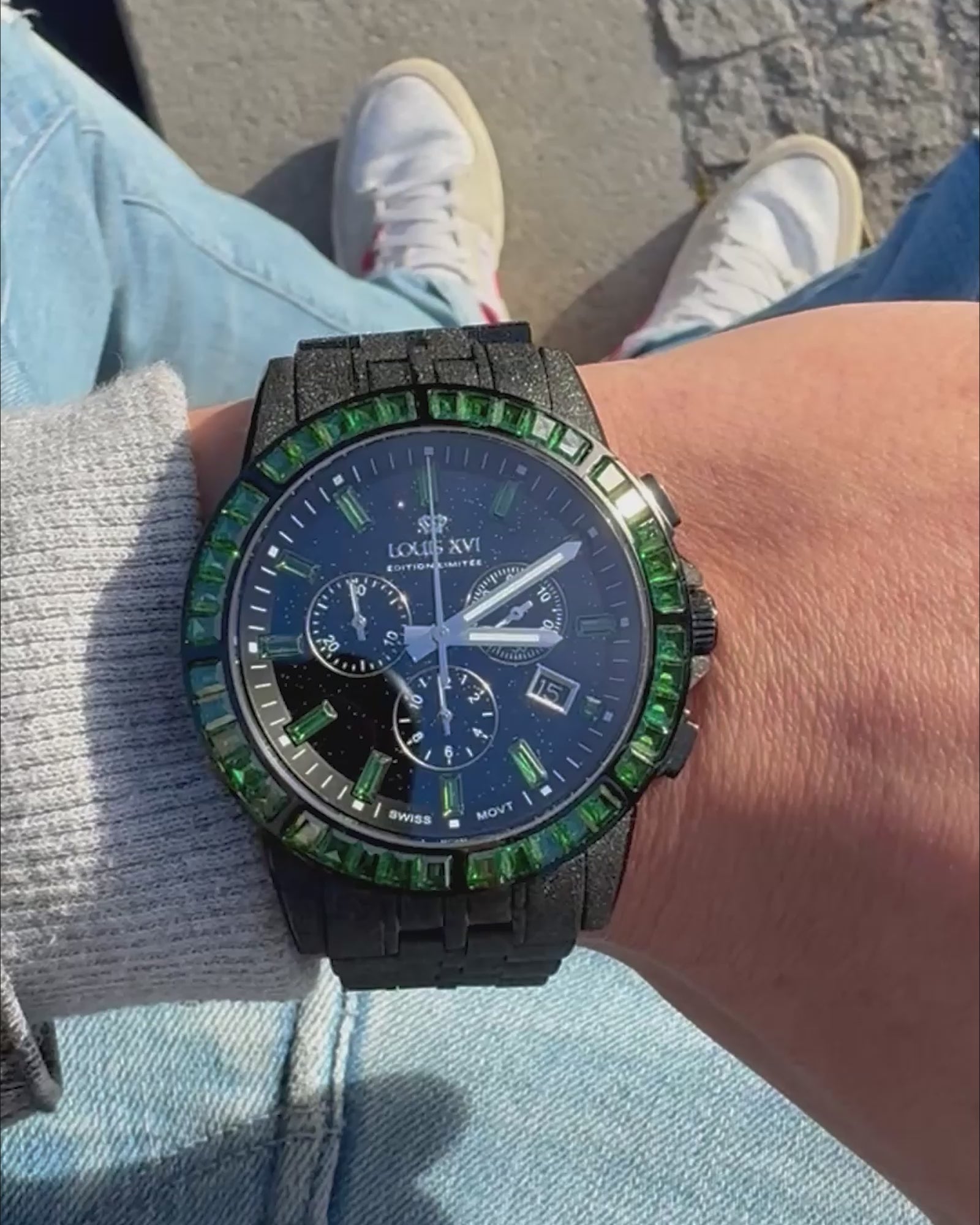 Mit der Majesté Frosted Iced Out 1182 – Emerald Green Edition setzen Sie ein beeindruckendes Statement. Diese exklusive Uhr kombiniert ein tiefschwarzes frosted PVD-Finish mit leuchtenden grünen Steinen, die an die faszinierende Eleganz von Smaragden erinnern. Durch ihre harmonische Verbindung von raffiniertem Design und höchster Funktionalität wird sie zu einem unverzichtbaren Accessoire für Liebhaber außergewöhnlicher Zeitmesser.