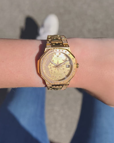Das Gehäuse und Armband aus edlem Goldton unterstreichen die luxuriöse Ausstrahlung, während das fein strukturierte Finish der Uhr eine moderne, selbstbewusste Note verleiht.