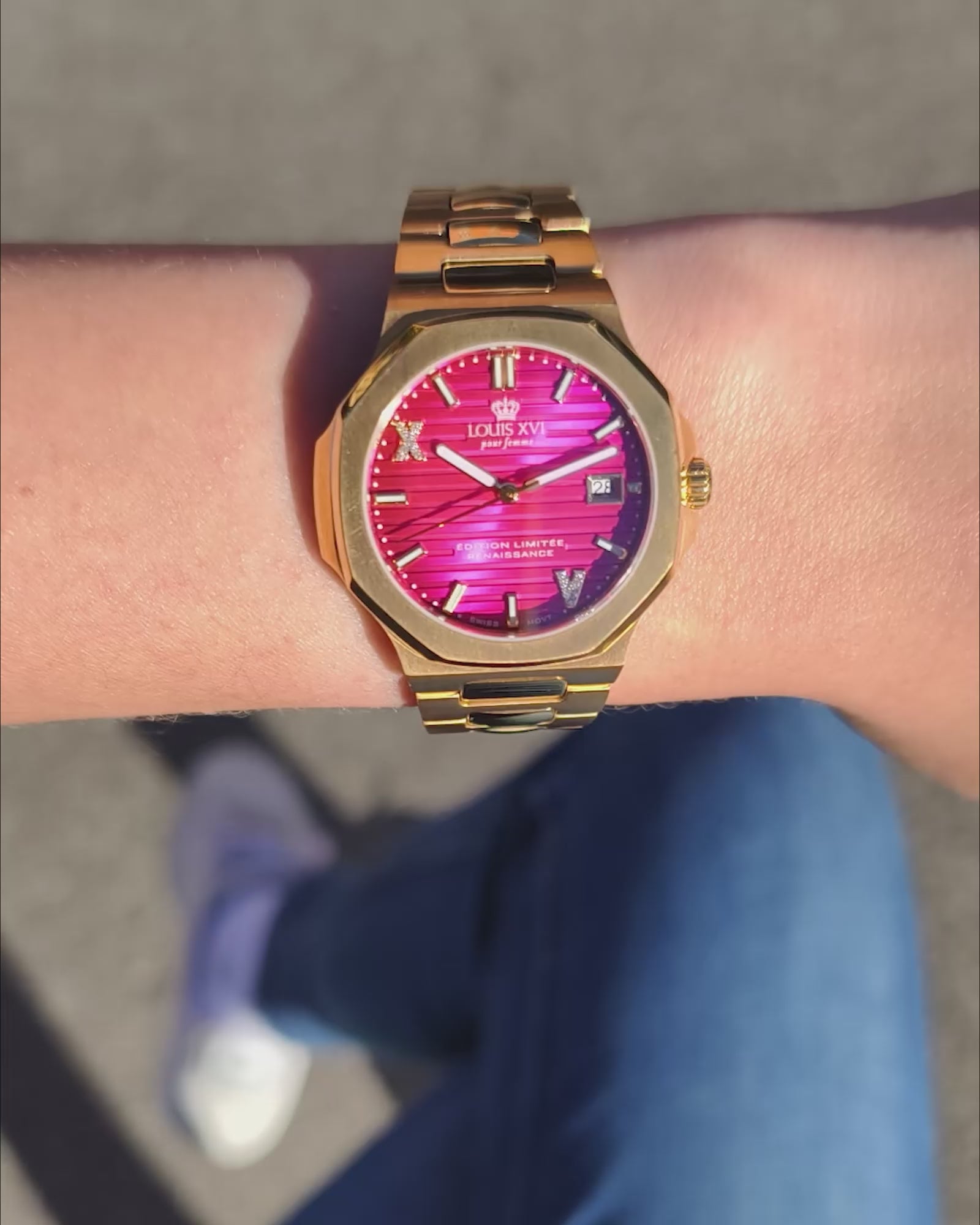 Das edle Gehäuse und Armband in Gold bilden den perfekten Kontrast zur leuchtenden Farbnuance – feminin, aber mit Charakter.