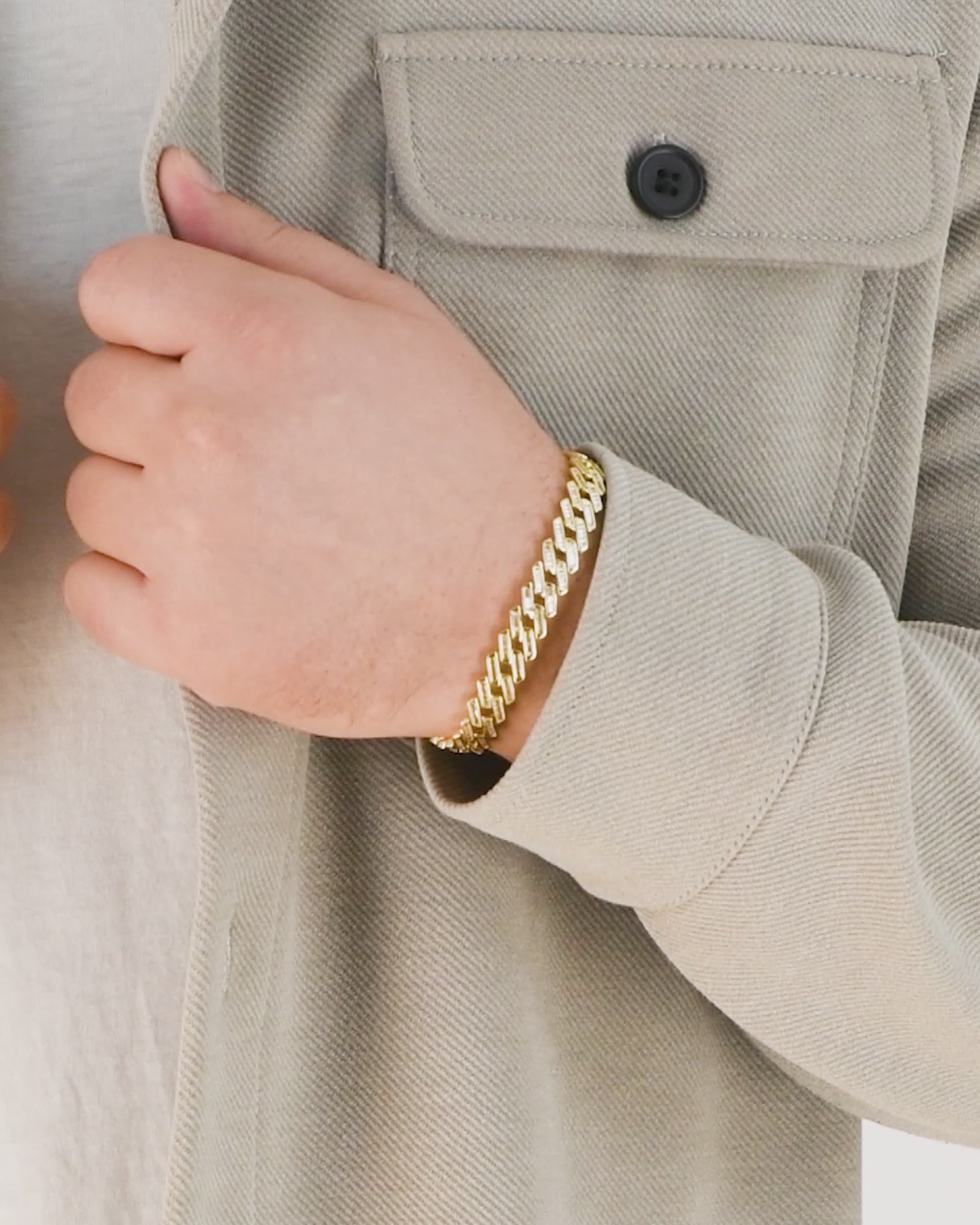 Detta 10 mm breda och uttrycksfulla armband av S925 sterlingsilver består av guldpläterade Cuban-Link med klara linjer och kompromisslös glans.