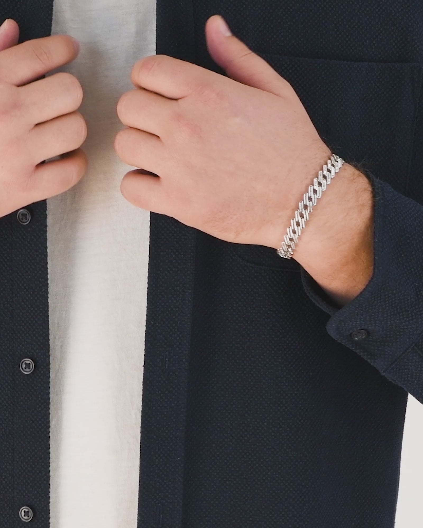 Detta populära armband i Cuban-stil av äkta S925 sterlingsilver ger med sin 10 mm bredd struktur åt handleden. De rektangulära infattningarna med baguette-zirkonia förenar klara linjer med en kraftfull närvaro. Med sina markanta länkar sitter det perfekt på handleden och drar allas blickar till sig. Det massiva boxlåset har en fullsatt baguetteplatta och är en extra accent.