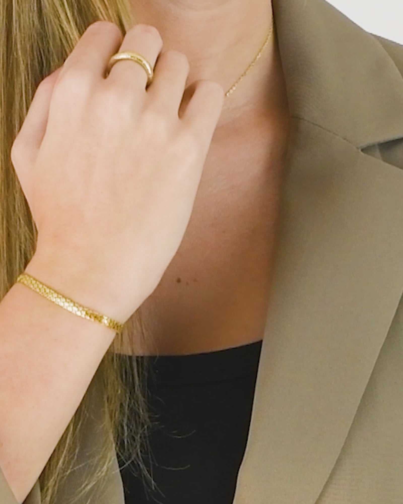 Detta armband av S925 sterlingsilver visar längs hela längden ett genombrutet spetsmönster med organiska, droppliknande öppningar. Det filigrana nätet låter ljuset spela genom länkarna och skapar en mjuk, livlig glans vid varje rörelse. Mjukt rundade kanter och en slätpolerad undersida ger en behaglig bärkomfort. Finns i två utföranden: 14K-guldfinish eller silver.