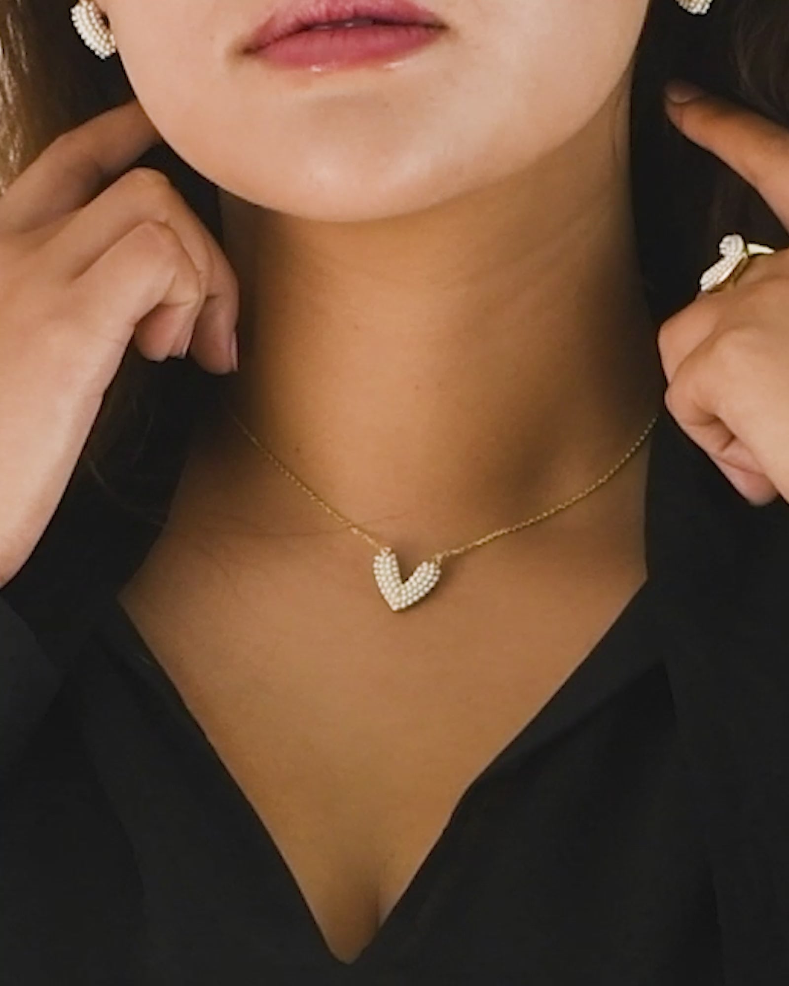 Halsbandet i S925 sterlingsilver med 14K guldplätering har ett modernt skulpturalt hängsmycke i hjärtform, helt omgivet av fina, små pärlor. Den täta arrangemanget ger en lugn, elegant glans och den förgyllda infattningen ramar in pärlorna och betonar den moderna hjärtformen.