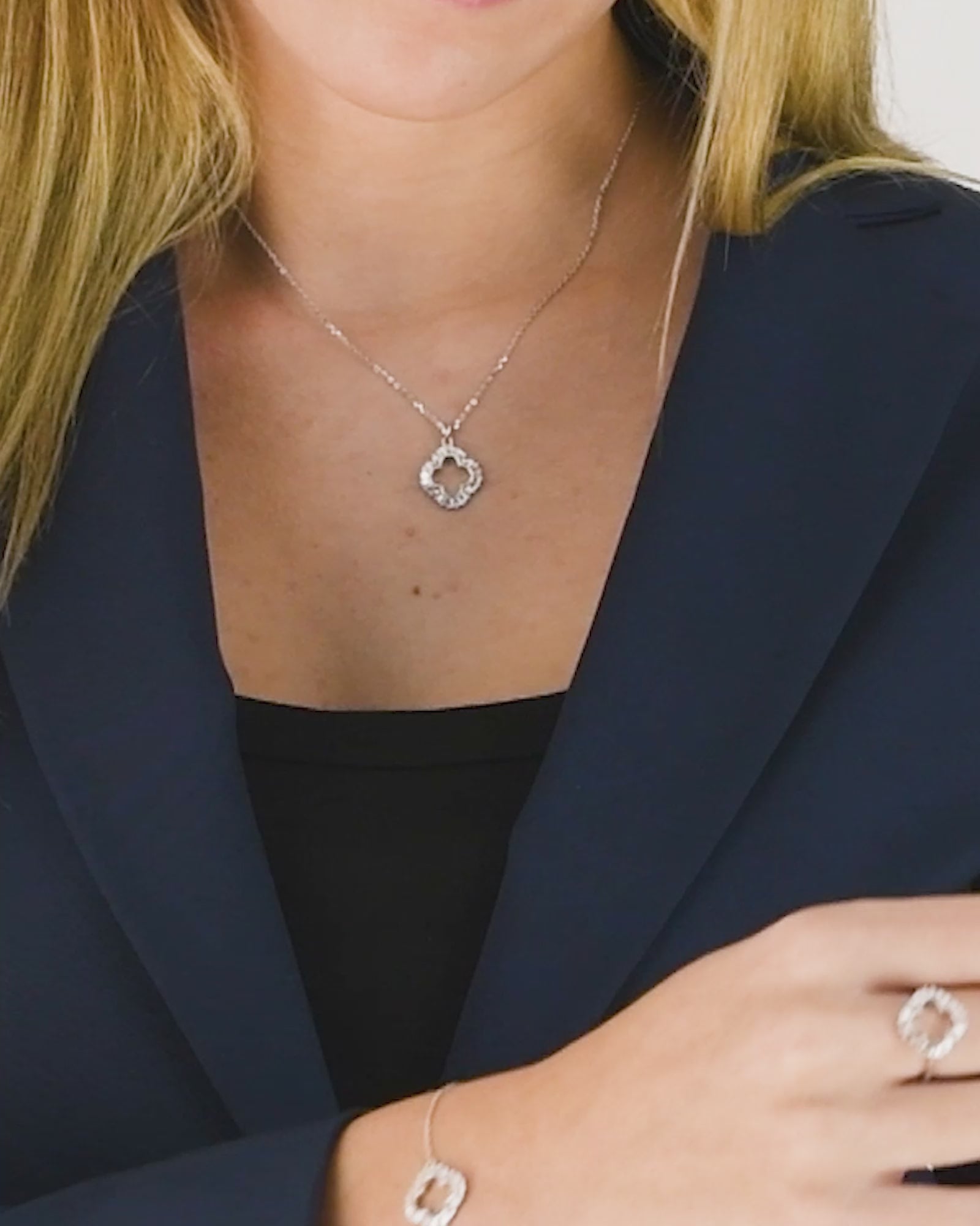 Detta armband i S925 sterlingsilver har ett öppet klöverbladselement, inramat av noggrant infattade baguette-zirkonia. I de fyra hörnen sätter runda zirkonia ljusa accenter, som små lyckoglimtar. Den fina kedjan lägger sig lätt på och kan justeras flexibelt via förlängningen. Ett polerat lås ger en harmonisk och säker avslutning. Fin glans, klar form – diskret lyx för varje dag. Mjuk glans, klar effekt – premium för vardagen.